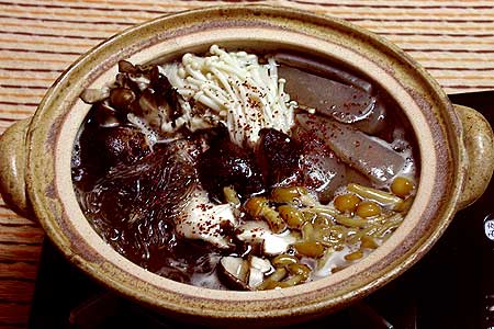 瓦锅放入海带和水。加上菇类和魔芋开火煮熟即可。